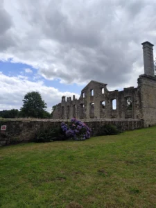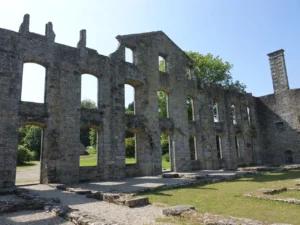 Seules persistent en élévation l’église et la façade ouest du bâtiment des hôtes. L’église, reconstruite au XVIIIe siècle est d’une rigueur toute classique.