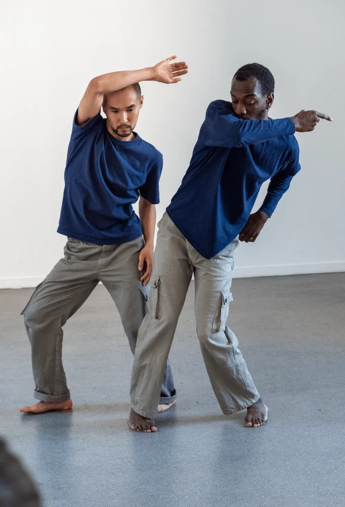Pour sa première pièce, le duo a fait le choix d’un support musical très épuré, sous forme de boucle, à partir d’un motif de polyrythmie et de mouvements géométriques. Leur gestuelle est un croisement entre la danse locking, la danse contemporaine et les arts martiaux.